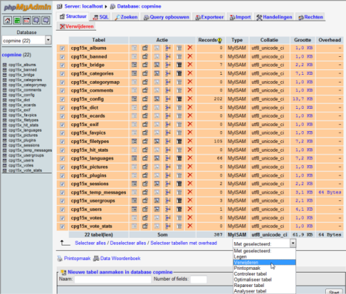 Gebruik een third-party programma zoals phpMyAdmin om alle coppermine tabellen te wissen (zie screenshot). U kan bepalen welke tabellen verwijderd moeten worden door te kijken naar de tabelprefixen: alle coppermine-tabellen gebruiken de tabelprefix die u kunt kiezen bij de eerste installatie van Coppermine. Als u niet zeker bent, voer dan eerst een backup uit (database dump) vooraleer de tabellen definitief te verwijderen. Standaard hebben de tabellen als prefix cpg15x_ (maar het kan anders zijn als u een andere prefix gekozen hebt bij de installatie). Wanneer u phpMyAdmin gebruikt, vink dan alle coppermine-tabellen aan, scroll helemaal tot beneden aan de pagina en kies "verwijderen" in het uitklapmenu "met geselecteerd". Bevestig de veiligheidsdialoog met "ja".