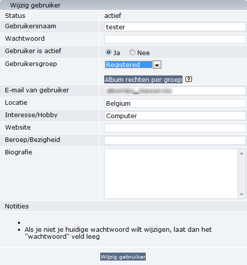 Please note that this screen (as well as the rest of Coppermine's user management) will not be available if you have enabled bridging, because then the user management of the application you have bridged with (e.g. your BBS) kicks in and handles everything related to user management.